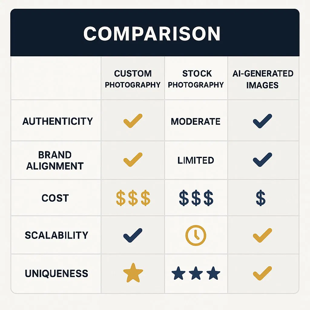To aid in this strategic decision, the following matrix provides an at-a-glance comparison of the key factors. A marketing director can use this to weigh the trade-offs based on their specific context. For a corporate homepage where establishing trust is paramount, the "Very High" authenticity of custom photography justifies the cost. For a content team tasked with producing 20 unique blog hero images this month on a tight budget, the combination of high customizability and low cost makes AI the logical choice.